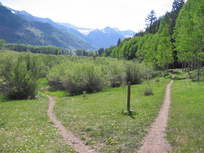This is a steep old road passing through the Spruce-Fir Forest. At the top of the Boomerang Road, there are some good views toward the mountains that are directly across. I took about 1:15 to complete the three mile walk. Once in the town of Telluride you will probably want to continue on the in town part of the River Trail.